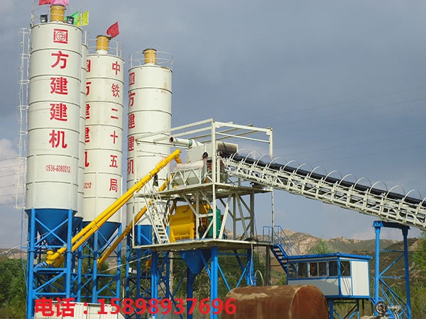 濰坊方建機械HZL60型混凝土攪拌樓產(chǎn)品結(jié)構(gòu)特點: 一、采用同樣主機JS1000,最大生產(chǎn)率可達60m3/h,比一般的提高20%,即自動循環(huán)時1分鐘一個循環(huán)(也可以說同樣生產(chǎn)率裝機功率數(shù)下降,能耗降低),其主要原因是增設(shè)了一個砂石計量斗。軸端密封采用分體式,即軸端密封 與軸端潤滑是分開的。 二、砂石計量斗與主機架布置在一起有3個特點。 1料斗底部氣缸開門卸料快,約8秒左右。 2后臺可用料臺式裝載機上料或懸臂拉鏟。 3采用料斗式裝載機上料,后臺布置緊湊,三個骨料倉一字形排列,使裝載機上料方便,占地少,總體布置美觀。 三、所有物料采用稱重法計量,保證計量精度穩(wěn)定可靠(有的用水流量 計),稱量選用高精度傳感器與電子秤,計量精度高達±1%。 四、可以同時采用四種骨料,一種水,三種水泥(含粉煤灰等摻和料),二種粉狀和二種液態(tài)外加劑(由用戶選擇)。 五、設(shè)有粉狀和液態(tài)外加劑儲存、輸送、自動計量系統(tǒng)。 六、電氣元件、氣路管件等關(guān)鍵件選用進口件,如限位開關(guān)等。 七、控制室隔離,螺旋機振動隔離,減少計量時振動影響及延長控制系統(tǒng)壽命等。 八、在砂石上料形式上,我公司設(shè)計有鋼絲繩提升料斗式和大傾角50°皮帶輸送機兩種供用戶選擇。